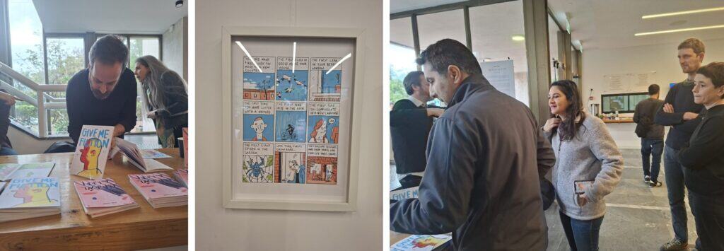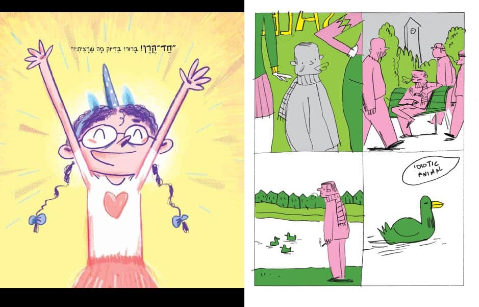 מימין: מתוך “Give Me Fiction” מאת עומר הופמן, משמאל: מתוך “חד קרן שהוא קרנף” מאת אורית גידלי (הוצאת כנרת)