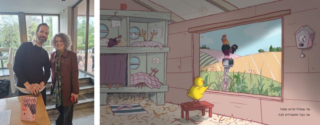 מתוך: “מוכנה-מוכנה” מאת אורית גידלי, איורים: עירית אביר, קורס טקסט-תמונה, מאיירימים. משמאל: עירית ועומר