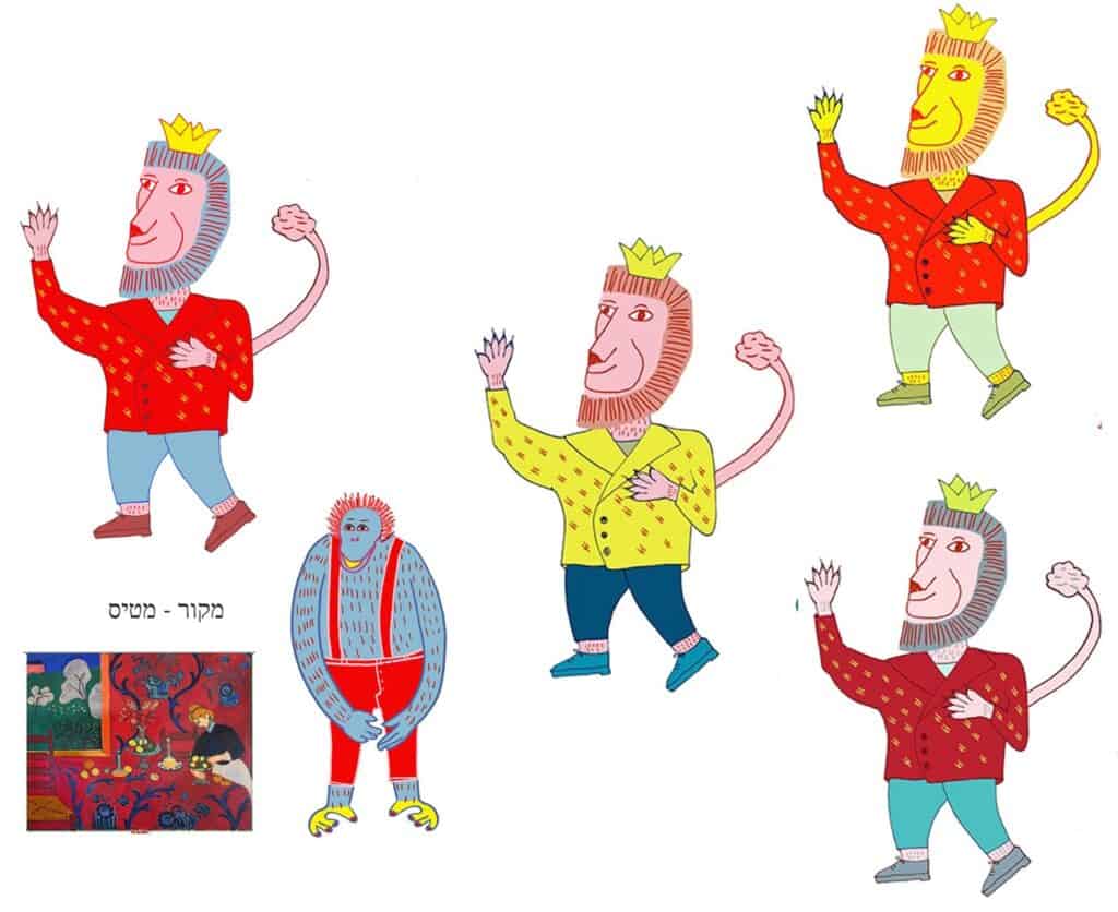 נכון שלספר קוראים “המלך אהר’לה פורש” והמלך אהר’לה באמת מת לפרוש, אבל זה לא באמת קורה בסוף. בעיצוב דמות – דמות הגיבור צריכה לייצג את מה שקורה בסיפור עצמו, אחרת הלקוח שלנו חושב שאנחנו לא מבינים מה אנחנו מאיירים. המלך אהר’לה קץ בעבודה הבלתי נסבלת של ניהול חיות הג’ונגל, עם כל השטויות והבלגן והכאב ראש וכפיות הטובה שלהן, לכן צריך לצייר אותו בסיטואציה. אבל כמו שאמרתי, אורלי היא תלמידה מופלאה שלוקחת משוב והופכת אותו לזהב טהור. כמה ימים אח”כ כבר הגיעו עוד סקיצות: