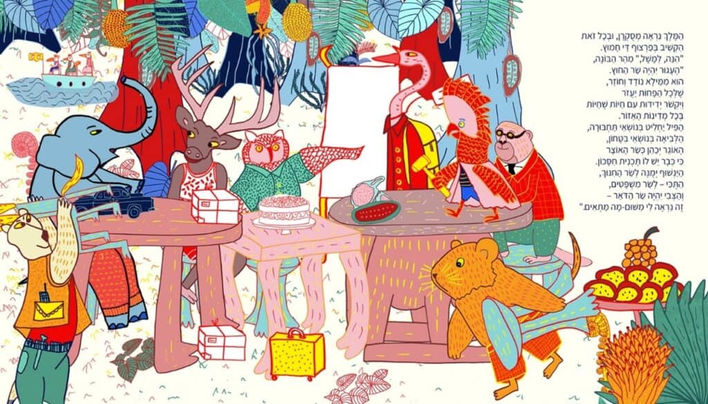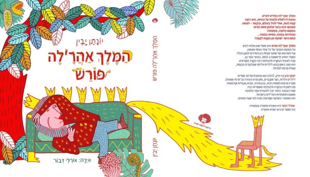 השער הגדול הוא עוד יותר טריקי, כי הוא בעצם שער הכניסה לספר הילדים. אם יש בספר “סוד” – כמו בסיפור “מיץ פטל” מאת חיה שנהב, שבו אנחנו מגלים די בסוף מיהו מיץ פטל, אסור בשום אופן להראות את זה בשער הגדול – זה הורס את ההפתעה. אפשר לרמוז. גם כאן: לספר הרי קוראים “המלך אהר’לה פורש”, אבל ככל שמתקדמים בספר אנחנו רואים שהחיות יעשו הכל כדי שהוא לא יפרוש, ובסוף הוא באמת לא פורש. אורלי מציירת אותו פורש בשער הגדול ויוצא למסע הגדול שלו: זו לא סיטואציה מהספר (זוכרות איך ביקשתי שעיצוב הדמות ייצג נאמנה את מה שקורה בטקסט?) אבל אנחנו בשער הגדול, ופה זה מותר: הילד הקורא יכנס לספר במחשבה שזה סיפור על החופש הגדול של אהר’לה, ויופתע לגלות שדווקא לא. זה כל הכיף בספר ילדים: הדואליות בין מה שרואים לבין מה שקוראים.