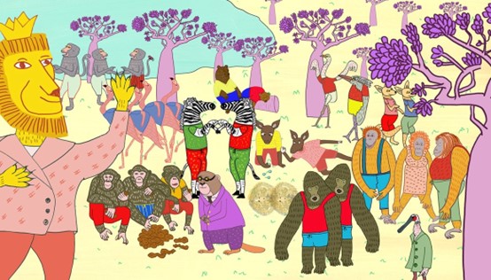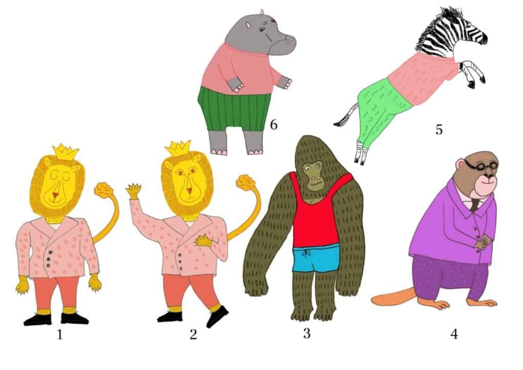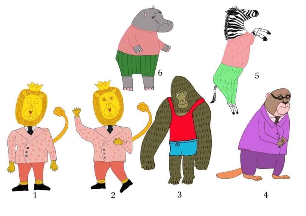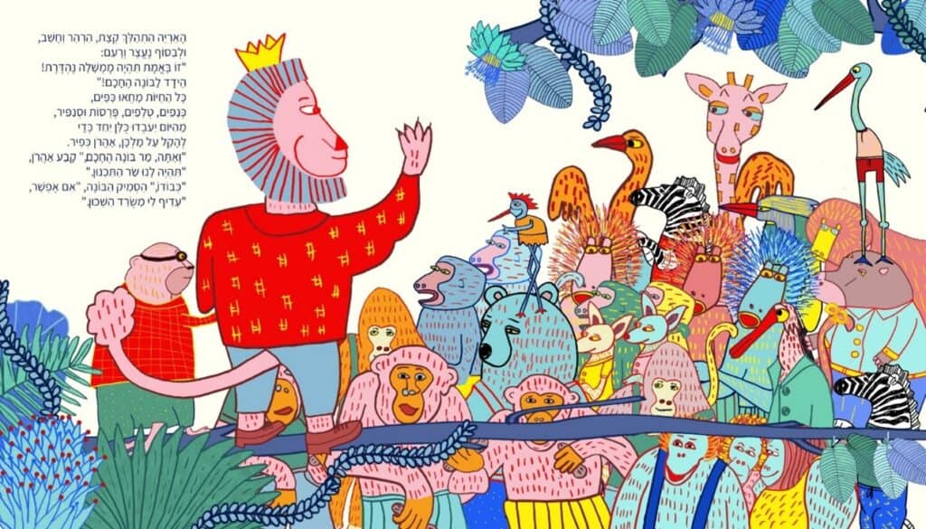 אחד הספרים החדשים יותר של יונתן, על הפוליטיקה של חיות הג’ונגל. במילים אחרות: המאיירות שבחרו את הספר הזה צריכות להיות מומחיות בהאנשה. יש הרבה מאד צורות להאניש בעלי-חיים באיור: ראש של חיה, גוף של אדם או ההיפך, עם בגדים או בלעדיהם, איזה חלק בגפיים נשאר חייתי ואיזה הופך לאנושי? מלא החלטות, שכל אחת מהן אומרת משהו אחר. בספר המקורי, המאייר עופר גץ ויונתן יבין החליטו להשאיר את החיות, כמו שהן: על ארבע, בלי האנשה בכלל. החיות רועות בנחת באחו, וכל מה שקורה ביניהן בסיפור נשאר בתוך הטקסט בלבד. זו החלטה מעניינת שנובעת משת”פ יחודי בין סופר למאייר. כאמן – סביר שלא הייתי לוקחת החלטה כזו על בסיס “דיוה” (וזו בדיוק הסיבה שעברתי לאייר רק את הספרים שאני כותבת). כמורה, אני לא יכולה לקבל החלטה כזו, כי כל מהות הקורס היא ללמוד איך לספר סיפור באמצעות איורים. היכולת הזו אקוטית והקורס נותן לתלמידיו כלים להמשך הדרך המקצועית שלהם ושלהן. בקיצור, החלטנו על האנשה ואורלי, שהיא אחת התלמידות הכי חרוצות ומוכשרות שהיו לי בחיים, עבדה כמו עשרים מאיירים לפחות כדי להגיע לתוצאה הנפלאה שלפנינו. הנה המסע שלה, ושיהיה ברור: על כל איור ששמתי פה, יש עשרה שלא. אין מה לעשות – רק העבודה משפרת.
