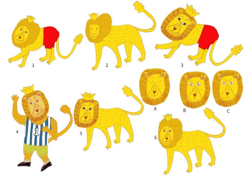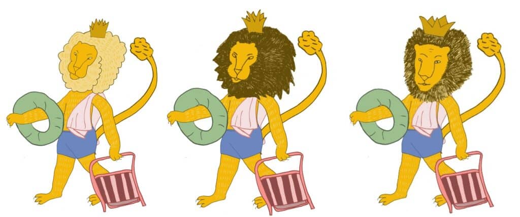 אם הייתי מתייחסת רק לסגנון האיור הייתי אומרת “יופי, הגענו הביתה, אבל הבעיה שלי כאן היתה עם ההחלטות לגבי האנשה: אורלי ניסתה לאכול את האריה ולהשאיר אותו שלם. יש הרבה צורות האנשה אבל כולן עובדות על עיקרון אחד: החיה עומדת על שתי רגליים (ולכן, אגב, האופנים השונים בהן אפשר להאניש בע”ח. זה קשור לסוג החיה וכמה טבעי היא עומדת על רגליה). מתי משאירים חיה עומדת על ארבע? כשרוצים להדגיש שגם בסיפור מואנש – יש בע”ח שהם לא חלק מהמשל, אלא נשארים חיות בר. גרסה 4 של אהר’לה היא היחידה שעובדת: האריה עומד על שתיים ולובש בגדים. זה עדיין לא מושלם כמובן: האריה לובש בגדי כדורגל (למה?) ויוצא לחופש. אבל האריה בסיפור של יונתן לא יוצא לחופש בסוף, אז עיצוב הדמות צריך לשקף את מה שיש בסיפור ולא מה שאין בו. אורלי עשתה עוד מקצה של עיצוב דמות, והביאה את אהר’לה הביתה.