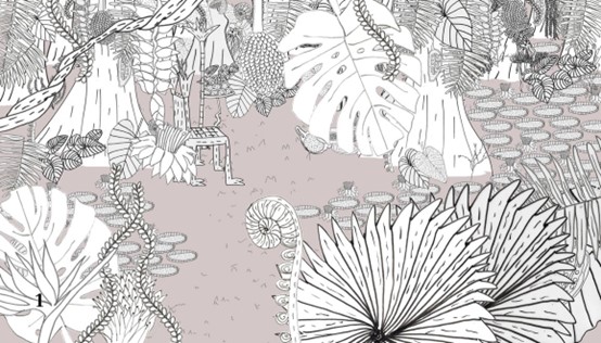 כל כמה שאורלי רצתה לתקן את האיור הזה, לא נתתי לה. איור קונספט לא מתקנים, כי אין צאנס שני לאיור קונספט גם בחיים האמיתיים: מה שהגשת ללקוח הוא מה שמוכר את הסגנון והפרשנות שלך… או שלא. מה שכן – הבנתי שאנחנו צריכות לעבוד כמו שצריך על הסביבה. איך נראה היער/ג’ונגל הזה? הוא אמור לייצג את סביבת העבודה המבאסת של אהר’לה המלך. איך עושות את זה?