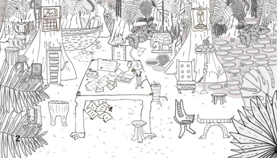 כל כמה שאני אוהבת את איור הסביבה הזה, שמבוסס על תחקיר, ויש בו המון מתחושת הג’ונגל – זה לא לגמרי סיפק לי את תחושת “המשרד” שאמורה להיות פה. רק “כסא המלכות” של אהר’לה מייצג את החלק האנושי בדמותו, וזה לא מספיק – הסיפור הוא משל על אנשים שמועבר דרך בעלי-חיים. אני צריכה ללמד את התלמידה שלי איך לגשת לאתגר המטורף הזה: ג’ונגל שהוא גם “משרד”.